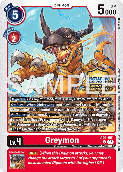 Lv.4 Greymon AD1-001 R Champion | Vaccine | Dinosaur/ADVENTURE 〔Digivolve〕 Lv.3 w/[Omnimon] in text or w/[ADVENTURE] trait: Cost 2 [On Play] [When Digivolving] You may return 1 card with [Greymon], [Garurumon] or [Omnimon] in its name from your trash to the hand. [All Turns] When your Digimon or Tamers are played or digivolve, if any of them have [Garurumon] or [Tai Kamiya] in their names, this Digimon may digivolve into a Digimon card with [Greymon] in its name in the hand without paying the cost. --- <Raid> (When this Digimon attacks, you may change the attack target to 1 of your opponent's unsuspended Digimon with the highest DP.)