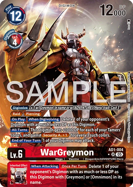 Lv.6 WarGreymon AD1-004 SR Mega | Vaccine | Dragonkin/ADVENTURE/Hero 〔Digivolve〕 Lv.5 w/[Greymon] in name or w/[ADVENTURE]/[Hero] trait: Cost 3<br><Raid> <Piercing><br>[On Play] [When Digivolving] Delete 1 of your opponent's Digimon with as much or less DP as this Digimon.<br>[All Turns] This Digimon gets +1000 DP for each of your Tamers' colors, and gains <Security A. +1> for every 3 such colors.<br>[End of Your Turn] 1 of your Digimon may attack. --- [When Attacking] [Once Per Turn] Delete 1 of your opponent's Digimon with as much or less DP as this Digimon with [Greymon] or [Omnimon] in its name.