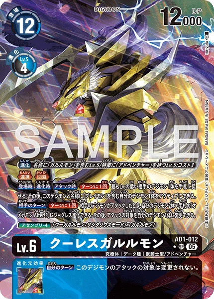 Lv.6 クーレスガルルモン AD1-012 SR 究極体 | データ種 | 獣騎士型/アドベンチャー ≪連携≫≪回避≫ 【登場時】【進化時】【アタック時】[ターンに1回]最もLv.の低い相手のデジモン1体を手札に戻せる。その後、このデジモンと名称に「グレイモン」を含む自分のデジモン1体をアクティブにできる。 【相手のターン】[ターンに1回]相手のデジモンがアタックしたとき、自分のデジモン2体で手札の「オメガモン Alter-S」にジョグレス進化できる。その後、アタックの対象を自分のデジモン1体に変更できる。 --- 【自分のターン】このデジモンのアタックの対象は変更されない。