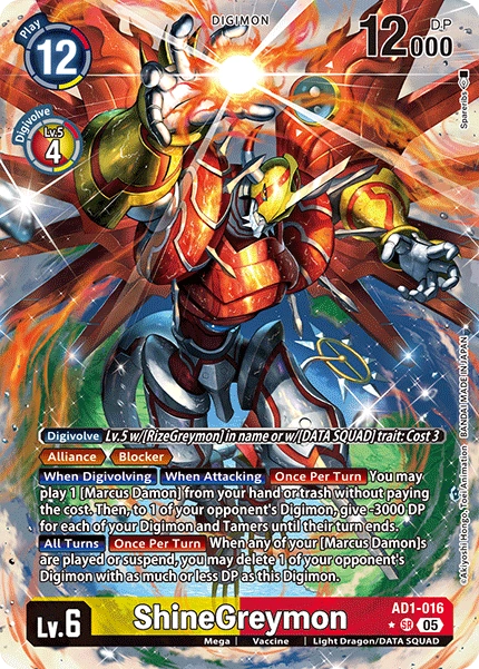 Lv.6 ShineGreymon AD1-016 SR Mega | Vaccine | Light Dragon/DATA SQUAD 〔Digivolve〕 Lv.5 w/[RizeGreymon] in name or w/[DATA SQUAD] trait: Cost 3<br><Alliance> <Blocker><br>[When Digivolving] [When Attacking] [Once Per Turn] You may play 1 [Marcus Damon] from your hand or trash without paying the cost. Then, to 1 of your opponent's Digimon, give -3000 DP for each of your Digimon and Tamers until their turn ends.<br>[All Turns] [Once Per Turn] When any of your [Marcus Damon]s are played or suspend, you may delete 1 of your opponent's Digimon with as much or less DP as this Digimon. --- -