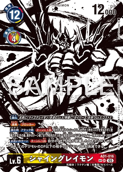 Lv.6 シャイングレイモン AD1-016 SR 究極体 | ワクチン種 | 光竜型/セイバーズ ≪連携≫≪ブロッカー≫ 【進化時】【アタック時】[ターンに1回]自分の手札/トラッシュから、「大門大」1枚をコストを支払わずに登場できる。その後、相手のターン終了まで、相手のデジモン1体を自分のデジモンとテイマー1体ごとに、DP-3000。 【お互いのターン】[ターンに1回]自分の「大門大」が登場したときかレストしたとき、このデジモンのDP以下の相手のデジモン1体を消滅できる。 ---