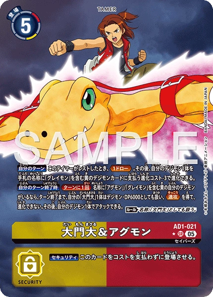 大門大&アグモン AD1-021 SR セイバーズ 【自分のターン】このテイマーがレストしたとき、≪1ドロー≫。その後、自分のデジモン1体を手札の名称に「グレイモン」を含む黄のデジモンカードに支払う進化コスト-3で進化できる。 【自分のターン終了時】[ターンに1回]名称に「アグモン」/「グレイモン」を含む黄の自分のデジモンがいるなら、ターン終了まで、自分の「大門大」1体はデジモン• DP6000としても扱い、≪速攻≫を得て、進化できない。その後、自分のデジモン1体でアタックできる。 〈ルール〉名称:「大門大」としても扱う。 --- 【セキュリティ】このカードをコストを支払わずに登場させる。