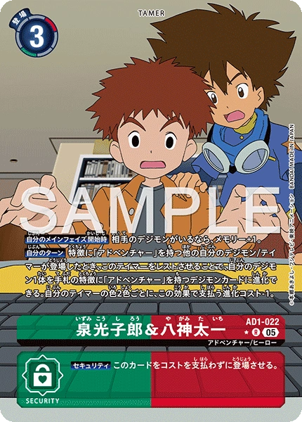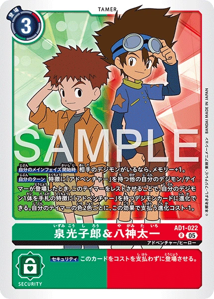 泉光子郎&八神太一 AD1-022 R アドベンチャー/ヒーロー 【自分のメインフェイズ開始時】相手のデジモンがいるなら、メモリー+1。 【自分のターン】特徴に「アドベンチャー」を持つ他の自分のデジモン/テイマーが登場したとき、このテイマーをレストさせることで、自分のデジモン1体を手札の特徴に「アドベンチャー」を持つデジモンカードに進化できる。自分のテイマーの色2色ごとに、この効果で支払う進化コスト-1。 --- 【セキュリティ】このカードをコストを支払わずに登場させる。