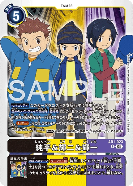 [All Turns] [Once Per Turn] When this Digimon with the [Hybrid] or [Ten Warriors] trait would leave the battle area, by adding your top security card to the hand, it doesn't leave.純平&輝二&輝一 AD1-023 R 【セキュリティ】このカードをコストを支払わずに登場させる。 【自分のメインフェイズ開始時】【登場時】自分の手札/トラッシュから、特徴に「ハイブリッド体」を持つ色の異なるカード2枚までをこのテイマーの下に置ける。この効果で置いたなら、≪1ドロー≫。その後、このテイマーの下に特徴に「ハイブリッド体」を持つカードが4枚以上あるなら、メモリー+2。 〈ルール〉名称:「柴山純平」/「源輝二」/「木村輝一」としても扱う。 --- 【お互いのターン】[ターンに1回]特徴に「ハイブリッド体」/「十闘士」を持つこのデジモンがバトルエリアを離れるとき、自分のセキュリティを上から1枚手札に加えることで、離れない。