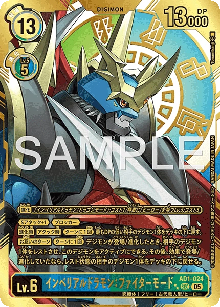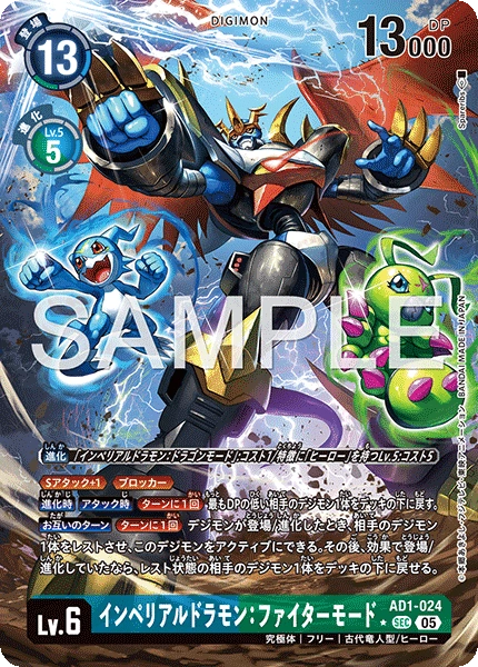 Lv.6 インペリアルドラモン:ファイターモード AD1-024 SEC 究極体 | フリー | 古代竜人型/ヒーロー ≪Sアタック+1≫≪ブロッカー≫ 【進化時】【アタック時】[ターンに1回]最もDPの低い相手のデジモン1体をデッキの下に戻す。 【お互いのターン】[ターンに1回]デジモンが登場/進化したとき、相手のデジモン1体をレストさせ、このデジモンをアクティブにできる。その後、効果で登場/進化していたなら、レスト状態の相手のデジモン1体をデッキの下に戻せる。 ---