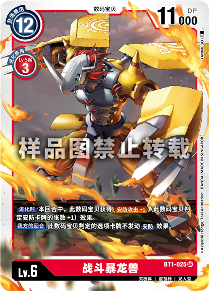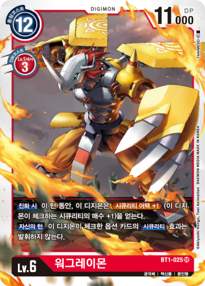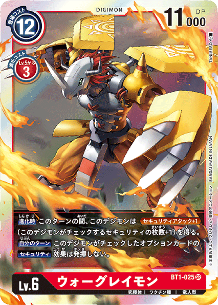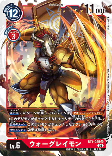 Lv.6 ウォーグレイモン BT1-025 SR 究極体 | ワクチン種 | 竜人型 【進化時】このターンの間、このデジモンは≪セキュリティアタック+1≫(このデジモンがチェックするセキュリティの枚数+1)を得る。 【自分のターン】このデジモンがチェックしたオプションカードの【セキュリティ】効果は発揮しない。 ---