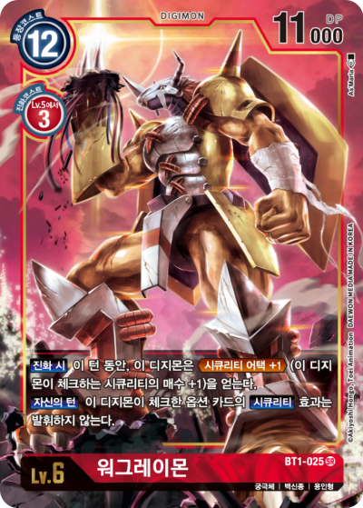 Lv.6 WarGreymon BT1-025 SR Mega | Vaccine | Dragonkin [When Digivolving] This Digimon gains <Security Attack +1> (This Digimon checks 1 additional security card) for the turn. [Your Turn] This card doesn't activate [Security] skills on Option Cards it checks. --- -
