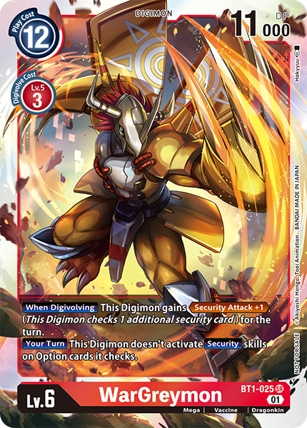 Lv.6 WarGreymon BT1-025 SR Mega | Vaccine | Dragonkin [When Digivolving] This Digimon gains <Security Attack +1> (This Digimon checks 1 additional security card) for the turn. [Your Turn] This Digimon doesn't activate [Security] skills on Option cards it checks. --- -
