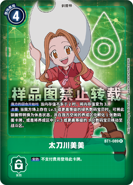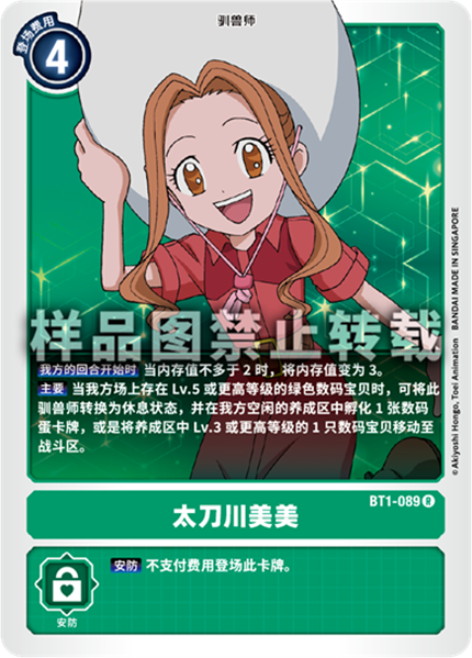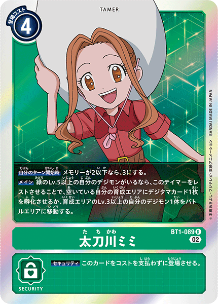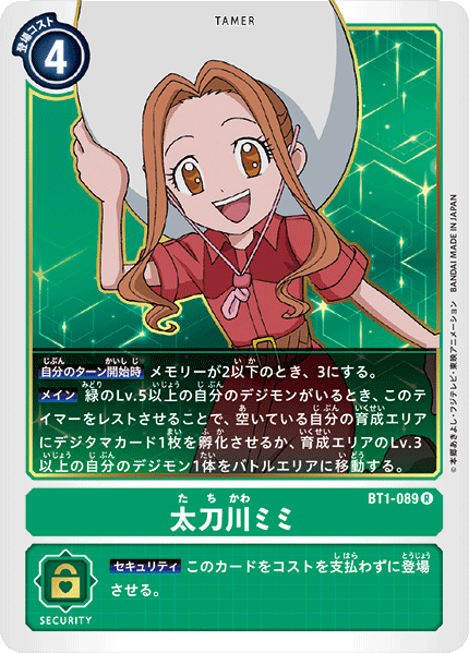 太刀川ミミ BT1-089 R 【自分のターン開始時】メモリーが2以下のとき、3にする。 【メイン】緑のLv.5以上の自分のデジモンがいるとき、このテイマーをレストさせることで、空いている自分の育成エリアにデジタマカード1枚を孵化させるか、育成エリアのLv.3以上の自分のデジモン1体をバトルエリアに移動する。 --- 【セキュリティ】このカードをコストを支払わずに登場させる。
