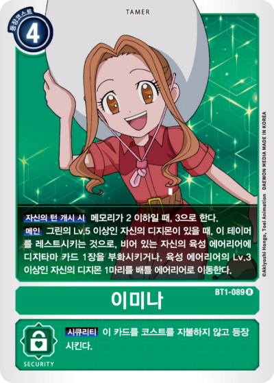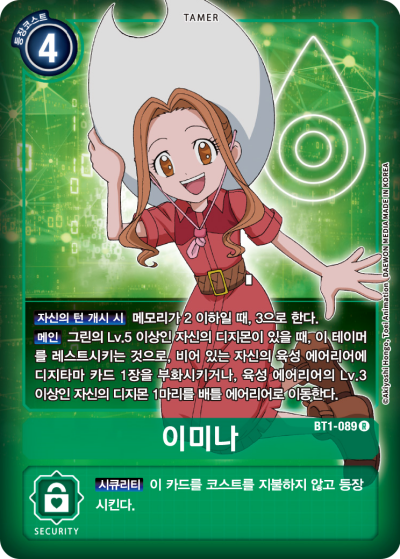 Mimi Tachikawa BT1-089 R [Start of Your Turn] If you have 2 or less memory, set your memory to 3.[Main] If you have a level 5 or higher green Digimon in play, you can suspend this Tamer to hatch 1 Digi-Egg card to an empty space in your breeding area, or move 1 level 3 or higher Digimon from your breeding area to your battle area. --- [Security] Play this card without paying its memory cost.