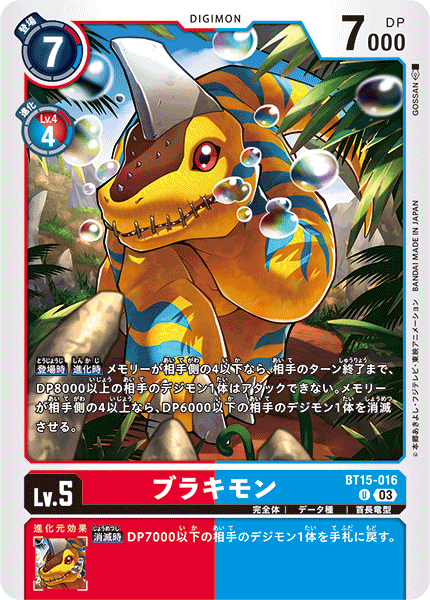 Lv.5 ブラキモン BT15-016 U 完全体 | データ種 | 首長竜型 【登場時】【進化時】メモリーが相手側の4以下なら、相手のターン終了まで、DP8000以上の相手のデジモン1体はアタックできない。メモリーが相手側の4以上なら、DP6000以下の相手のデジモン1体を消滅させる。 --- 【消滅時】DP7000以下の相手のデジモン1体を手札に戻す。
