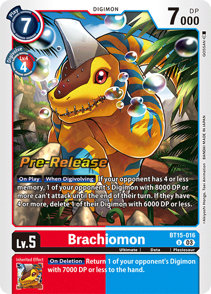Lv.5 Brachiomon BT15-016 U Ultimate | Data | Plesiosaur [On Play] [When Digivolving] If your opponent has 4 or less memory, 1 of your opponent's Digimon with 8000 DP or more can't attack until the end of their turn. If they have 4 or more, delete 1 of their Digimon with 6000 DP or less. --- [On Deletion] Return 1 of your opponent's Digimon with 7000 DP or less to the hand.