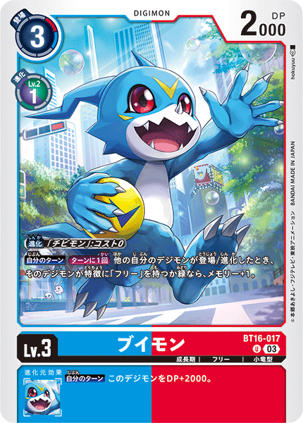 Lv.3 ブイモン BT16-017 U 成長期 | フリー | 小竜型 【自分のターン】[ターンに1回]他の自分のデジモンが登場/進化したとき、そのデジモンが特徴に「フリー」を持つか緑なら、メモリー+1。 --- 【自分のターン】このデジモンをDP+2000。