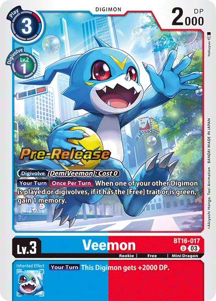 Lv.3 Veemon BT16-017 U rookie | Free | Mini Dragon [Digivolve] [DemiVeemon]: Cost 0 [Your Turn] [Once Per Turn] When one of your other Digimon is played or digivolves, if it has the [Free] trait or is green, gain 1 memory. --- [Your Turn] This Digimon gets +2000 DP.