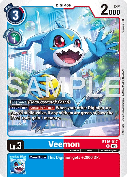 Lv.3 Veemon BT16-017 U Rookie | Free | Mini Dragon [Your Turn] [Once Per Turn] When one of your other Digimon is played or digivolves, if it has the [Free] trait or is green, gain 1 memory. --- [Your Turn] This Digimon gets +2000 DP.