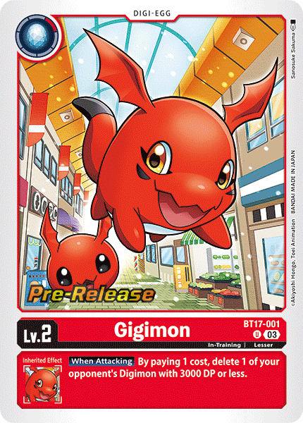 Lv.2 Gigimon BT17-001 U In-Training | Lesser - --- [When Attacking] By paying 1 cost, delete 1 of your opponent's Digimon with 3000 DP or less.
