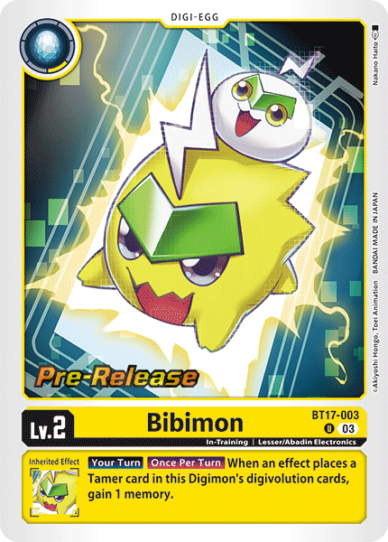 Lv.2 Bibimon BT17-003 U in-training | Lesser/Abadin Electronics --- [Your Turn] [Once Per Turn] When an effect places a Tamer card in this Digimon's digivolution cards, gain 1 memory.