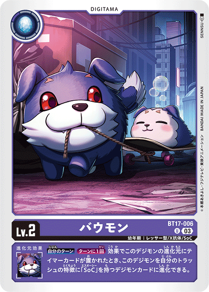 Lv.2 バウモン BT17-006 U 幼年期 | レッサー型/X抗体/SoC --- 【自分のターン】[ターンに1回]効果でこのデジモンの進化元にテイマーカードが置かれたとき、このデジモンを自分のトラッシュの特徴に「SoC」を持つデジモンカードに進化できる。