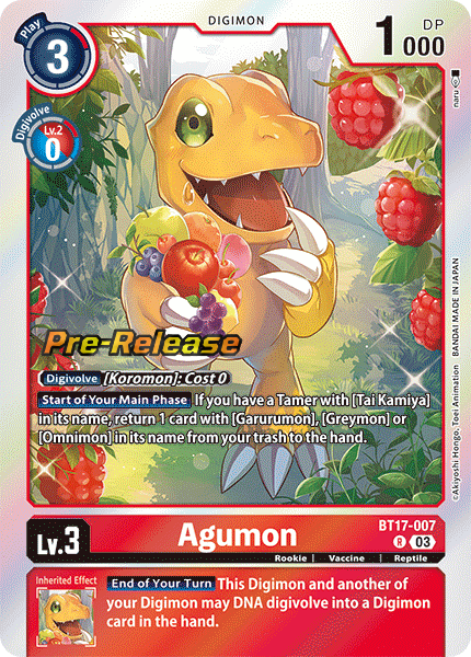 Lv.3 Agumon BT17-007 R Rookie | Vaccine | Reptile [Digivolve] [Koromon]: Cost 0 [Start of Your Main Phase] If you have a Tamer with [Tai Kamiya] in its name, return 1 card with [Garurumon], [Greymon] or [Omnimon] in its name from your trash to the hand. --- [End of Your Turn] This Digimon and another of your Digimon may DNA digivolve into a Digimon card in the hand.