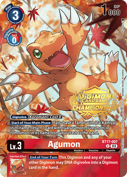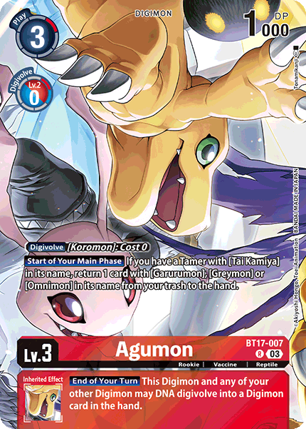 Lv.3 Agumon BT17-007 R rookie | Vaccine | Reptile [Digivolve] [Koromon]: Cost 0 [Start of Your Main Phase] If you have a Tamer with [Tai Kamiya] in its name, return 1 card with [Garurumon], [Greymon] or [Omnimon] in its name from your trash to the hand. --- [End of Your Turn] This Digimon and another of your Digimon may DNA digivolve into a Digimon card in the hand.