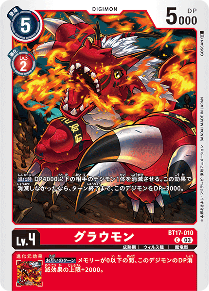 Lv.4 グラウモン BT17-010 C 成熟期 | ウィルス種 | 魔竜型 【進化時】DP4000以下の相手のデジモン1体を消滅させる。この効果で消滅しなかったなら、ターン終了まで、このデジモンをDP+3000。 --- 【お互いのターン】メモリーが0以下の間、このデジモンのDP消滅効果の上限+2000。