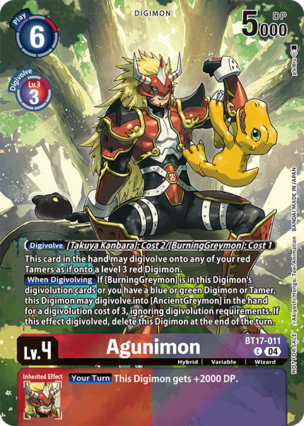 Lv.4 Agunimon BT17-011 C Hybrid | Variable | Wizard [Digivolve] [Takuya Kanbara]: Cost 2 [Digivolve] [BurningGreymon]: Cost 1 You may digivolve this card from your hand onto one of your red Tamers as if that card is a level 3 red Digimon. [When Digivolving] If [BurningGreymon] is in this Digimon's digivolution cards or you have a blue or green Digimon or Tamer, this Digimon may digivolve into [AncientGreymon] in the hand for a digivolution cost of 3, ignoring its digivolution requirements. If digivolved by this effect, delete this Digimon at the end of the turn. --- [Your Turn] This Digimon gets +2000 DP.