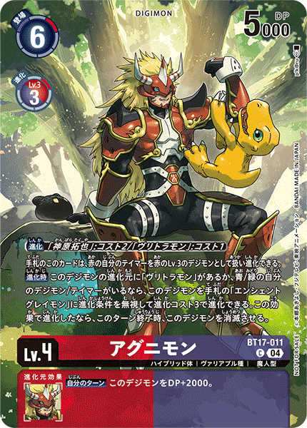 Lv.4 アグニモン BT17-011 C ハイブリッド体 | ヴァリアブル種 | 魔人型 手札のこのカードは、赤の自分のテイマーを赤のLv.3のデジモンとして扱い進化できる。 【進化時】このデジモンの進化元に「ヴリトラモン」があるか、青/緑の自分のデジモン/テイマーがいるなら、このデジモンを手札の「エンシェントグレイモン」に進化条件を無視して進化コスト3で進化できる。この効果で進化したなら、このターン終了時、このデジモンを消滅させる。 --- 【自分のターン】このデジモンをDP+2000。