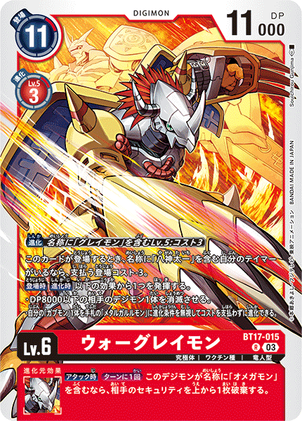 Lv.6 ウォーグレイモン BT17-015 R 究極体 | ワクチン種 | 竜人型 このカードが登場するとき、名称に「八神太一」を含む自分のテイマーがいるなら、支払う登場コスト-3。 【登場時】【進化時】以下の効果から1つを発揮する。 • DP8000以下の相手のデジモン1体を消滅させる。 • 自分の「ガブモン」1体を手札の「メタルガルルモン」に進化条件を無視してコストを支払わずに進化できる。 --- 【アタック時】[ターンに1回]このデジモンが名称に「オメガモン」を含むなら、相手のセキュリティを上から1枚破棄する。