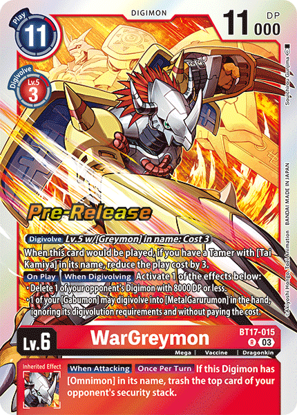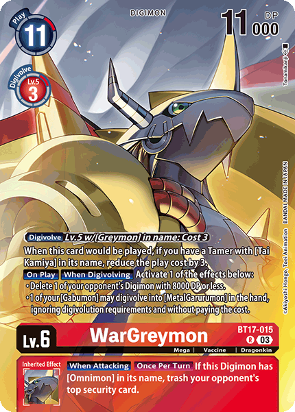 Lv.6 WarGreymon BT17-015 R Mega | Vaccine | Dragonkin [Digivolve] Lv.5 w/[Greymon] in name: Cost 3 When this card would be played, if you have a Tamer with [Tai Kamiya] in its name, reduce the play cost by 3. [On Play] [When Digivolving] Activate 1 of the effects below: • Delete 1 of your opponent's Digimon with 8000 DP or less. • 1 of your [Gabumon] may digivolve into [MetalGarurumon] in the hand, ignoring its digivolution requirements and without paying the cost. --- [When Attacking] [Once Per Turn] If this Digimon has [Omnimon] in its name, trash the top card of your opponent's security stack.