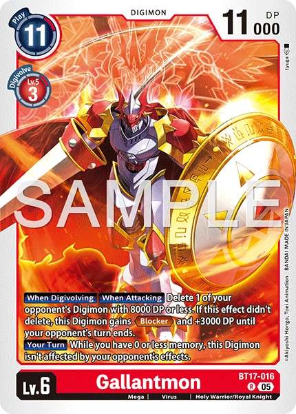 Lv.6 Gallantmon BT17-016 R mega | Virus | Holy Warrior/Royal Knight [When Digivolving] [When Attacking] Delete 1 of your opponent's Digimon with 8000 DP or less. If this effect didn't delete, this Digimon gets +3000 DP and gains <Blocker> until the end of your opponent's turn. [Your Turn] While you have 0 or less memory, this Digimon isn't affected by your opponent's effects.