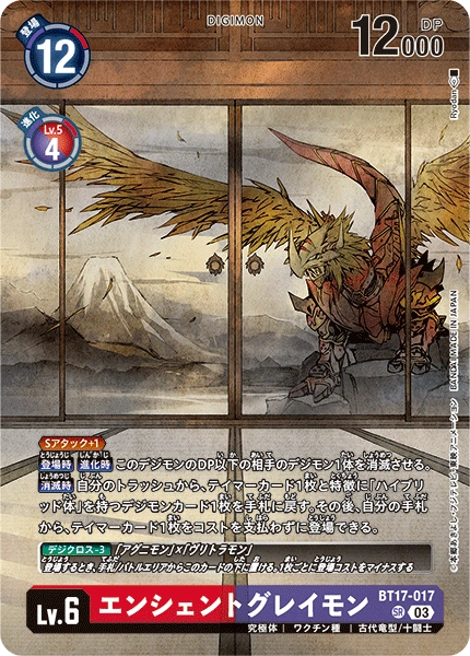 Lv.6 エンシェントグレイモン BT17-017 SR 究極体 | ワクチン種 | 古代竜型/十闘士 ≪Sアタック+1≫ 【登場時】【進化時】このデジモンのDP以下の相手のデジモン1体を消滅させる。 【消滅時】自分のトラッシュから、テイマーカードと特徴に「ハイブリッド体」を持つデジモンカード1枚ずつを手札に戻す。その後、自分の手札から、テイマーカード1枚をコストを支払わずに登場できる。 ---