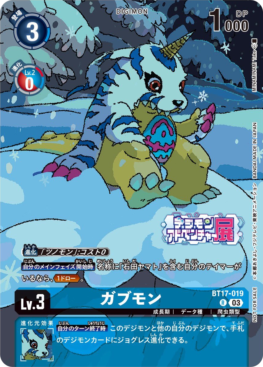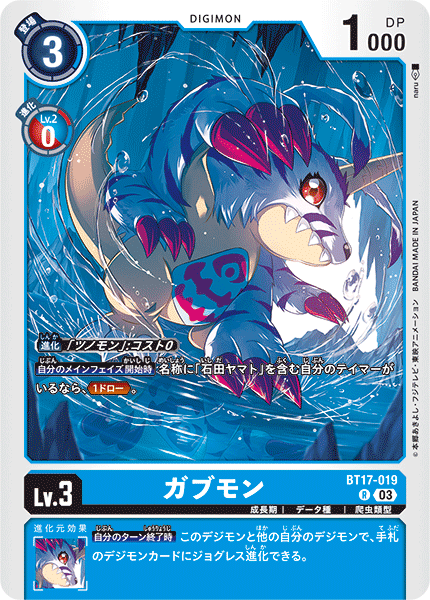Lv.3 ガブモン BT17-019 R 成長期 | データ種 | 爬虫類型 【自分のメインフェイズ開始時】名称に「石田ヤマト」を含む自分のテイマーがいるなら、≪1ドロー≫。 --- 【自分のターン終了時】このデジモンと他の自分のデジモンで、手札のデジモンカードにジョグレス進化できる。