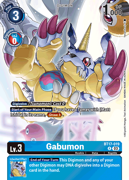 Lv.3 Gabumon BT17-019 R Rookie | Data | Reptile [Start of Your Main Phase] If you have a Tamer with [Matt Ishida] in its name, <Draw 1>. --- [End of Your Turn] This Digimon and another of your Digimon may DNA digivolve into a Digimon card in the hand.