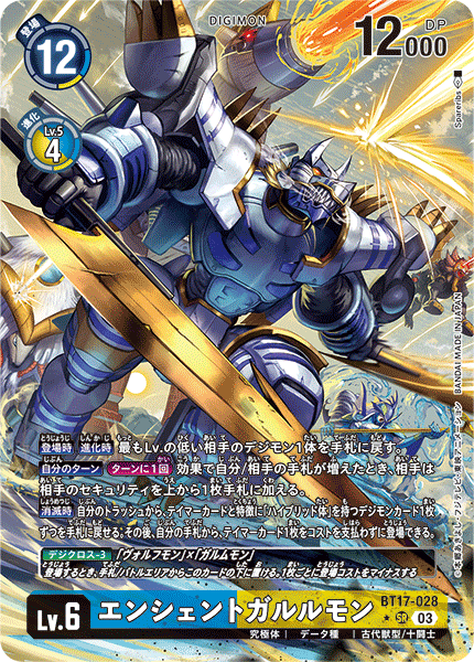 Lv.6 エンシェントガルルモン BT17-028 SR 究極体 | データ種 | 古代獣型/十闘士 【登場時】【進化時】最もLv.の低い相手のデジモン1体を手札に戻す。 【自分のターン】[ターンに1回]効果で自分/相手の手札が増えたとき、相手は相手のセキュリティを上から1枚手札に加える。 【消滅時】自分のトラッシュから、テイマーカードと特徴に「ハイブリッド体」を持つデジモンカード1枚ずつを手札に戻せる。その後、自分の手札から、テイマーカード1枚をコストを支払わずに登場できる。 ---