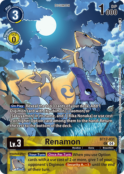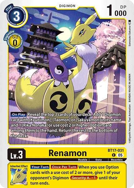 Lv.3 Renamon BT17-031 C rookie | Data | Beastkin [On Play] Reveal the top 3 cards of your deck. Add 1 Digimon card with [Kyubimon], [Taomon] or [Sakuyamon] in its name, and 1 [Rika Nonaka] or 1 Option card with a cost of 2 or more among them to the hand. Return the rest to the bottom of the deck. --- [Your Turn] [Once Per Turn] When you use an Option card with a cost of 2 or more, 1 of your opponent's Digimon gains <Security A. -1> until the end of their turn.