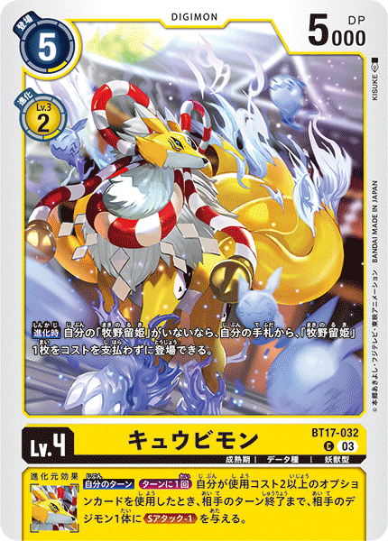 Lv.4 キュウビモン BT17-032 C 成熟期 | データ種 | 妖獣型 【進化時】自分の「牧野留姫」がいないなら、自分の手札から、「牧野留姫」1枚をコストを支払わずに登場できる。 --- 【自分のターン】[ターンに1回]自分が使用コスト2以上のオプションカードを使用したとき、相手のターン終了まで、相手のデジモン1体に≪Sアタック-1≫を与える。