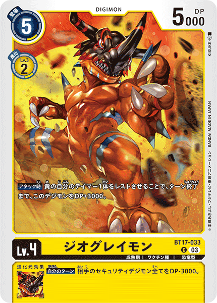 Lv.4 ジオグレイモン BT17-033 C 成熟期 | ワクチン種 | 恐竜型 【アタック時】黄の自分のテイマー1体をレストさせることで、ターン終了まで、このデジモンをDP+3000。 --- 【自分のターン】相手のセキュリティデジモン全てをDP-3000。