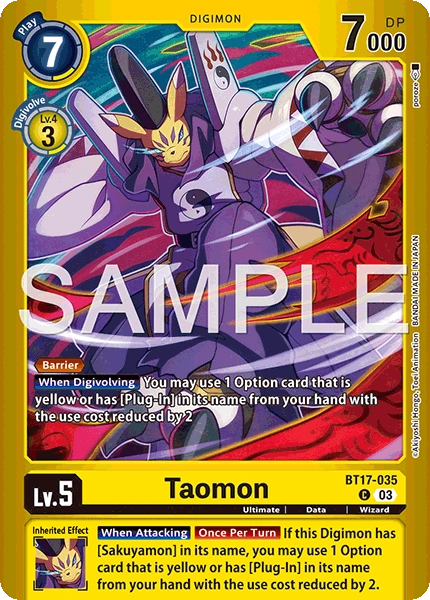 Lv.5 Taomon BT17-035 C Ultimate | Data | Wizard <Barrier> [When Digivolving] You may use 1 Option card that has [Plug-In] in its name or is yellow from your hand with the cost reduced by 2. --- [When Attacking] [Once Per Turn] If this Digimon has [Sakuyamon] in its name, you may use 1 Option card that has [Plug-In] in its name or is yellow from your hand with the cost reduced by 2.