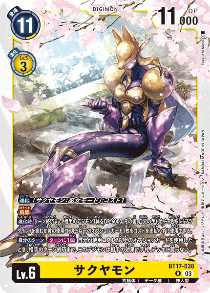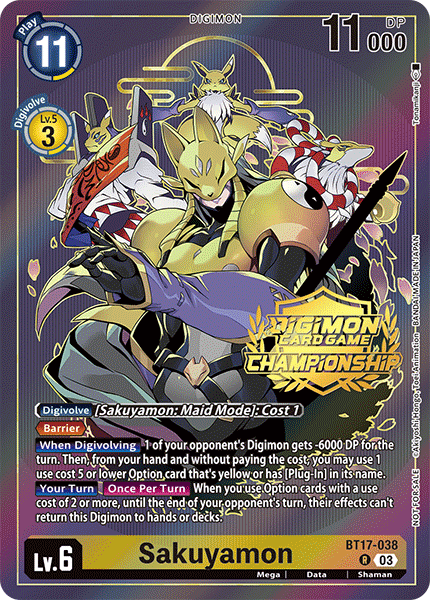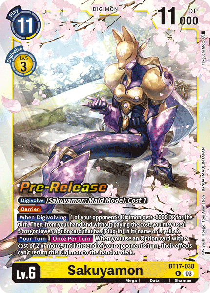 Lv.6 Sakuyamon BT17-038 R mega | Data | Shaman [Digivolve] [Sakuyamon: Maid Mode]: Cost 1 <Barrier> [When Digivolving] 1 of your opponent's Digimon gets -6000 DP for the turn. Then, you may use 1 Option card with [Plug-In] in its name or 1 yellow Option card with a cost of 5 or less from your hand without paying the cost. [Your Turn] [Once Per Turn] When you use an Option card with a cost of 2 or more, this Digimon can't be returned to hand or deck by your opponent's effects until the end of their turn.