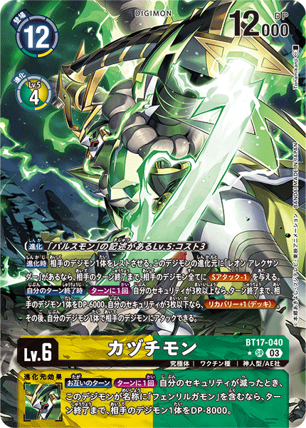 Lv.6 カヅチモン BT17-040 SR 究極体 | ワクチン種 | 神人型/AE社 【進化時】相手のデジモン1体をレストさせる。このデジモンの進化元に「レオン アレクサンダー」があるなら、相手のターン終了まで、相手のデジモン全てに≪Sアタック-1≫を与える。 【自分のターン終了時】[ターンに1回]自分のセキュリティが3枚以上なら、ターン終了まで、相手のデジモン1体をDP-6000。自分のセキュリティが3枚以下なら、≪リカバリー+1《デッキ》≫。その後、自分のデジモン1体で相手のデジモンにアタックできる。 --- 【お互いのターン】[ターンに1回]自分のセキュリティが減ったとき、このデジモンが名称に「フェンリルガモン」を含むなら、ターン終了まで、相手のデジモン1体をDP-8000。