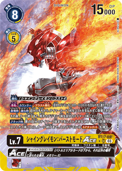 Lv.7 シャイングレイモン:バーストモードACE BT17-041 SR 究極体 | ワクチン種 | 光竜型 [手札]【カウンター】≪ブラスト進化≫(自分のデジモンをこのカードにコストを支払わずに進化できる) 【登場時】【進化時】自分の手札から、テイマーカード1枚をコストを支払わずに登場できる。その後、ターン終了まで、相手のデジモン1体を自分のテイマー1体ごとに、DP-5000。 【アタック時】黄の自分のテイマー2体までをレストさせることで、この効果でレストした1体ごとに、ターン終了まで、このデジモンは≪Sアタック+1≫を得る。 ---