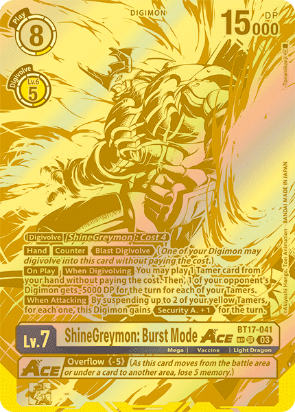 Lv.7 ShineGreymon: Burst Mode ACE BT17-041 SR Mega | Vaccine | Light Dragon [Digivolve] [ShineGreymon]: Cost 4 [Hand] [Counter] <Blast Digivolve> (One of your Digimon may digivolve into this card without paying the cost.) [On Play] [When Digivolving] You may play 1 Tamer card from your hand without paying the cost. Then, 1 of your opponent's Digimon gets -5000 DP for the turn for each of your Tamers. [When Attacking] By suspending up to 2 of your yellow Tamers, for each one, this Digimon gains <Security A. +1> for the turn. --- <Overflow (-5)> (As this card moves from the battle area or under a card to another area, lose 5 memory.)
