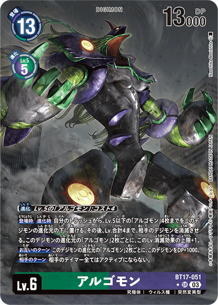 Lv.6 アルゴモン BT17-051 SR 究極体 | ウィルス種 | 突然変異型 【登場時】【進化時】自分のトラッシュから、Lv.5以下の「アルゴモン」4枚までをこのデジモンの進化元の下に置ける。その後、Lv.合計4まで、相手のデジモンを消滅させる。このデジモンの進化元の「アルゴモン」2枚ごとに、このLv.消滅効果の上限+1。 【お互いのターン】このデジモンの進化元の「アルゴモン」2枚ごとに、このデジモンをDP+1000。 【相手のターン】相手のテイマー全てはアクティブにならない。 ---