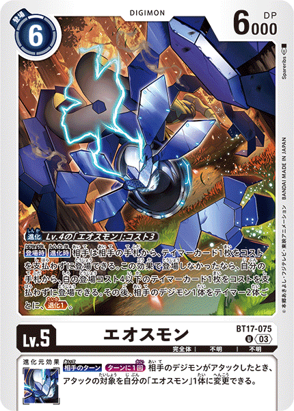 Lv.5 エオスモン BT17-075 U 完全体 | 不明 | 不明 【登場時】【進化時】相手は相手の手札から、テイマーカード1枚をコストを支払わずに登場できる。この効果で登場しなかったなら、自分の手札から、白の登場コスト4以下のテイマーカード1枚をコストを支払わずに登場できる。その後、相手のデジモン1体をテイマー2体ごとに、≪退化1≫。 --- 【相手のターン】[ターンに1回]相手のデジモンがアタックしたとき、アタックの対象を自分の「エオスモン」1体に変更できる。