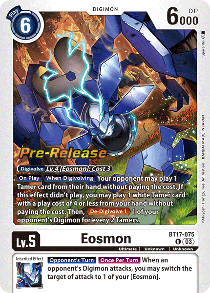 Lv.5 Eosmon BT17-075 U Ultimate | Unknown | Unknown [On Play] [When Digivolving] Your opponent may play 1 Tamer card from their hand without paying the cost. If this effect didn't play, you may play 1 white Tamer card with a play cost of 4 or less from your hand without paying the cost. Then, <De-Digivolve 1> 1 of your opponent's Digimon for every 2 Tamers. --- [Opponent's Turn] [Once Per Turn] When an opponent's Digimon attacks, you may switch the target of attack to 1 of your [Eosmon].