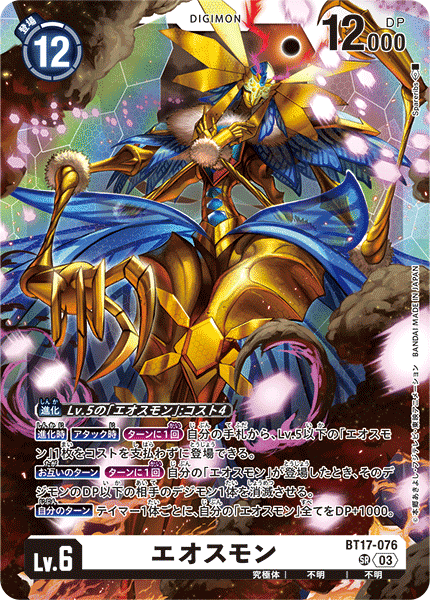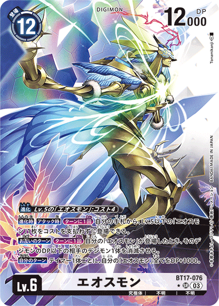 Lv.6 エオスモン BT17-076 SR 究極体 | 不明 | 不明 【進化時】【アタック時】[ターンに1回]自分の手札から、Lv.5以下の「エオスモン」1枚をコストを支払わずに登場できる。 【お互いのターン】[ターンに1回]自分の「エオスモン」が登場したとき、そのデジモンのDP以下の相手のデジモン1体を消滅させる。 【自分のターン】テイマー1体ごとに、自分の「エオスモン」全てをDP+1000。 ---
