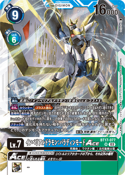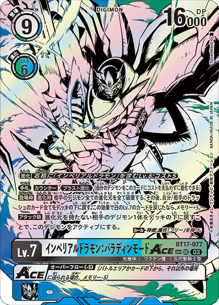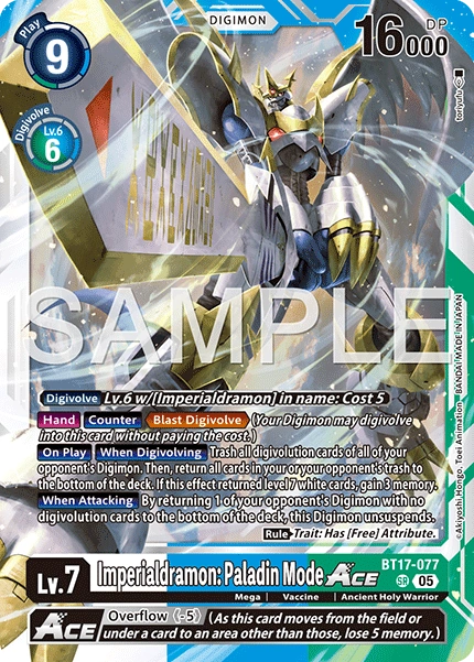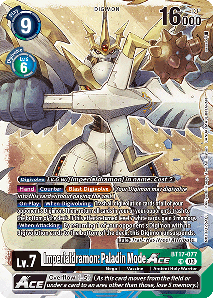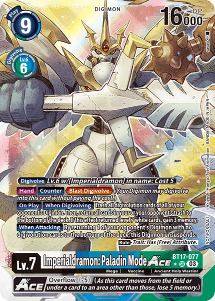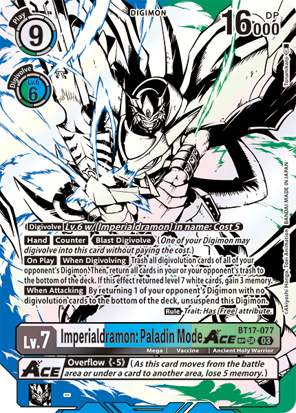 Lv.7 Imperialdramon: Paladin Mode ACE BT17-077 SR mega | Vaccine | Ancient Holy Warrior [Digivolve] Lv.6 w/[Imperialdramon] in name: Cost 5 [Hand] [Counter] <Blast Digivolve> (One of your Digimon may digivolve into this card without paying the cost.) [On Play] [When Digivolving] Trash all digivolution cards of all of your opponent's Digimon. Then, return all cards from your or your opponent's trash to the bottom of the deck. If this effect returned a white level 7 card, gain 3 memory. [When Attacking] By returning 1 of your opponent's Digimon with no digivolution cards to the bottom of the deck, unsuspend this Digimon. (Rule) Trait: Has [Free] Attribute. --- <Overflow (-5)> (As this card moves from the battle area or under a card to another area, lose 5 memory.)
