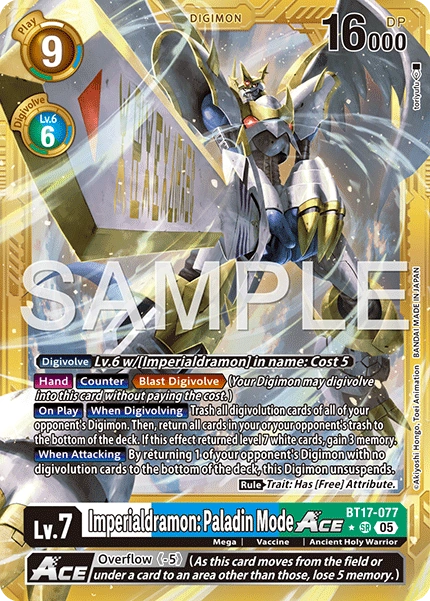 Lv.7 Imperialdramon: Paladin Mode ACE BT17-077 SR Mega | Vaccine | Ancient Holy Warrior [Digivolve] Lv.6 w/[Imperialdramon] in name: Cost 5 [Hand] [Counter] <Blast Digivolve> (One of your Digimon may digivolve into this card without paying the cost.) [On Play] [When Digivolving] Trash all digivolution cards of all of your opponent's Digimon. Then, return all cards in your or your opponent's trash to the bottom of the deck. If this effect returned level 7 white cards, gain 3 memory. [When Attacking] By returning 1 of your opponent's Digimon with no digivolution cards to the bottom of the deck, unsuspend this Digimon. (Rule) Trait: Has [Free] attribute. --- <Overflow (-5)> (As this card moves from the battle area or under a card to another area, lose 5 memory.)