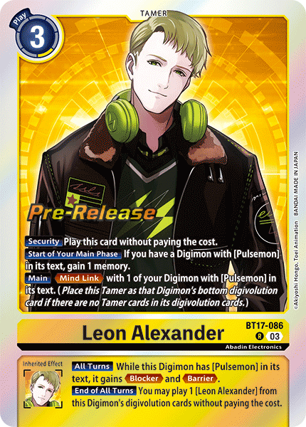 Leon Alexander BT17-086 R Abadin Electronics [Security] Play this card without paying the cost. [Start of Your Main Phase] If you have a Digimon with [Pulsemon] in its text, gain 1 memory. [Main] <Mind Link> with 1 of your Digimon with [Pulsemon] in its text. (Place this Tamer as that Digimon's bottom digivolution card if there are no Tamer cards in its digivolution cards.) --- [All Turns] While this Digimon has [Pulsemon] in its text, it gains <Blocker> and <Barrier>. [End of All Turns] You may play 1 [Leon Alexander] from this Digimon's digivolution cards without paying the cost.