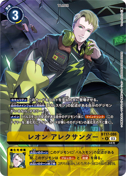 レオン アレクサンダー BT17-086 R AE社 【セキュリティ】このカードをコストを支払わずに登場させる。 【自分のメインフェイズ開始時】「パルスモン」の記述がある自分のデジモンがいるなら、メモリー+1。 【メイン】「パルスモン」の記述がある自分のデジモン1体に≪マインドリンク≫(このテイマーを、進化元にテイマーカードが無いそのデジモンの進化元の下に置く)。 --- 【お互いのターン】このデジモンに「パルスモン」の記述がある間、このデジモンは≪ブロッカー≫と≪防壁≫を得る。 【お互いのターン終了時】このデジモンの進化元から、「レオン アレクサンダー」1枚をコストを支払わずに登場できる。